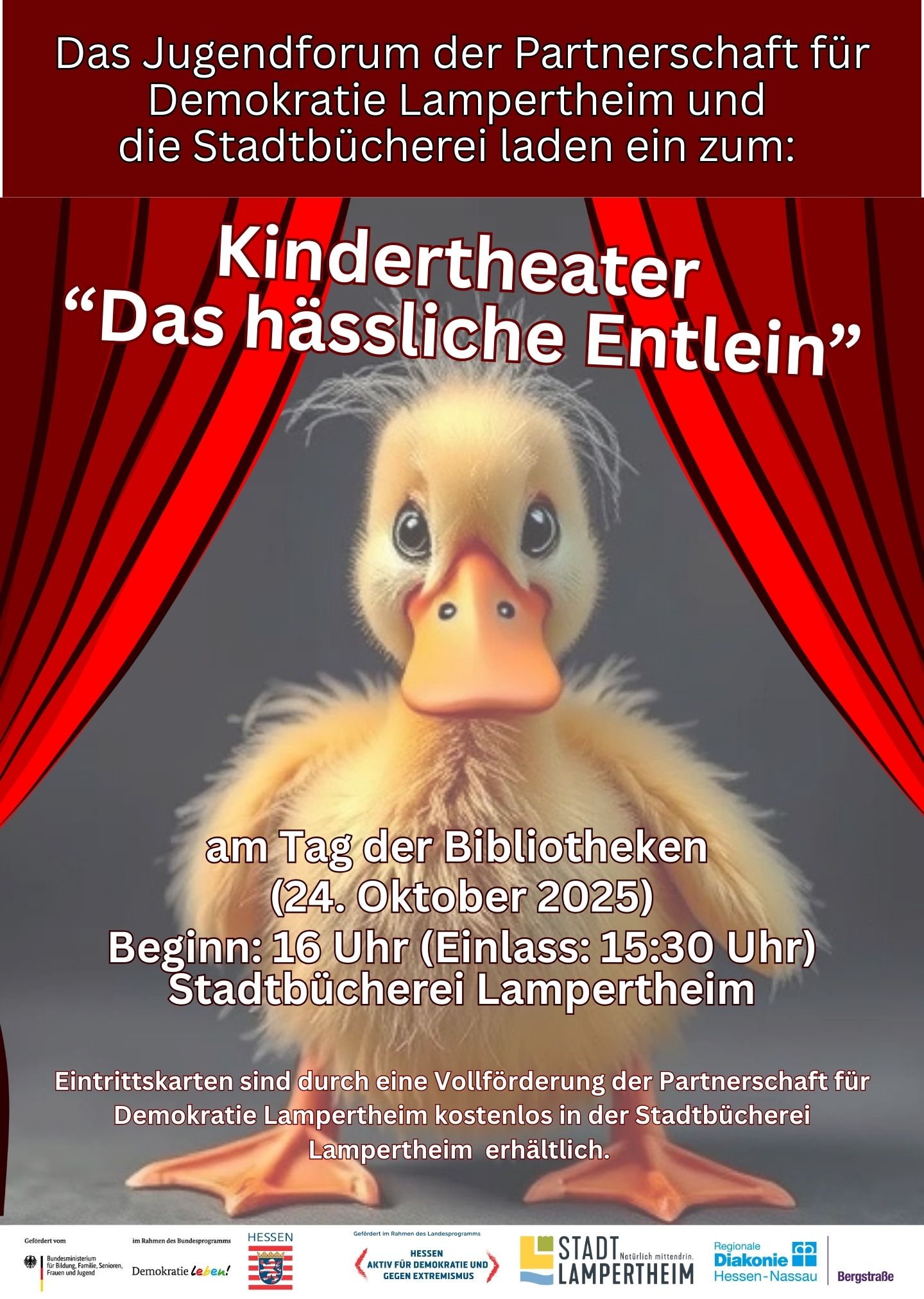 Am Freitag, den 24. Oktober 2025, lädt das Jugendforum der Partnerschaft für Demokratie Lampertheim gemeinsam mit der Stadtbücherei Lampertheim zum Kindertheater ein. Anlass ist der Tag der Bibliotheken. Die Vorstellung beginnt um 16:00 Uhr. Der Einlass startet bereits um 15:30 Uhr. Veranstaltungsort ist die Stadtbücherei Lampertheim.